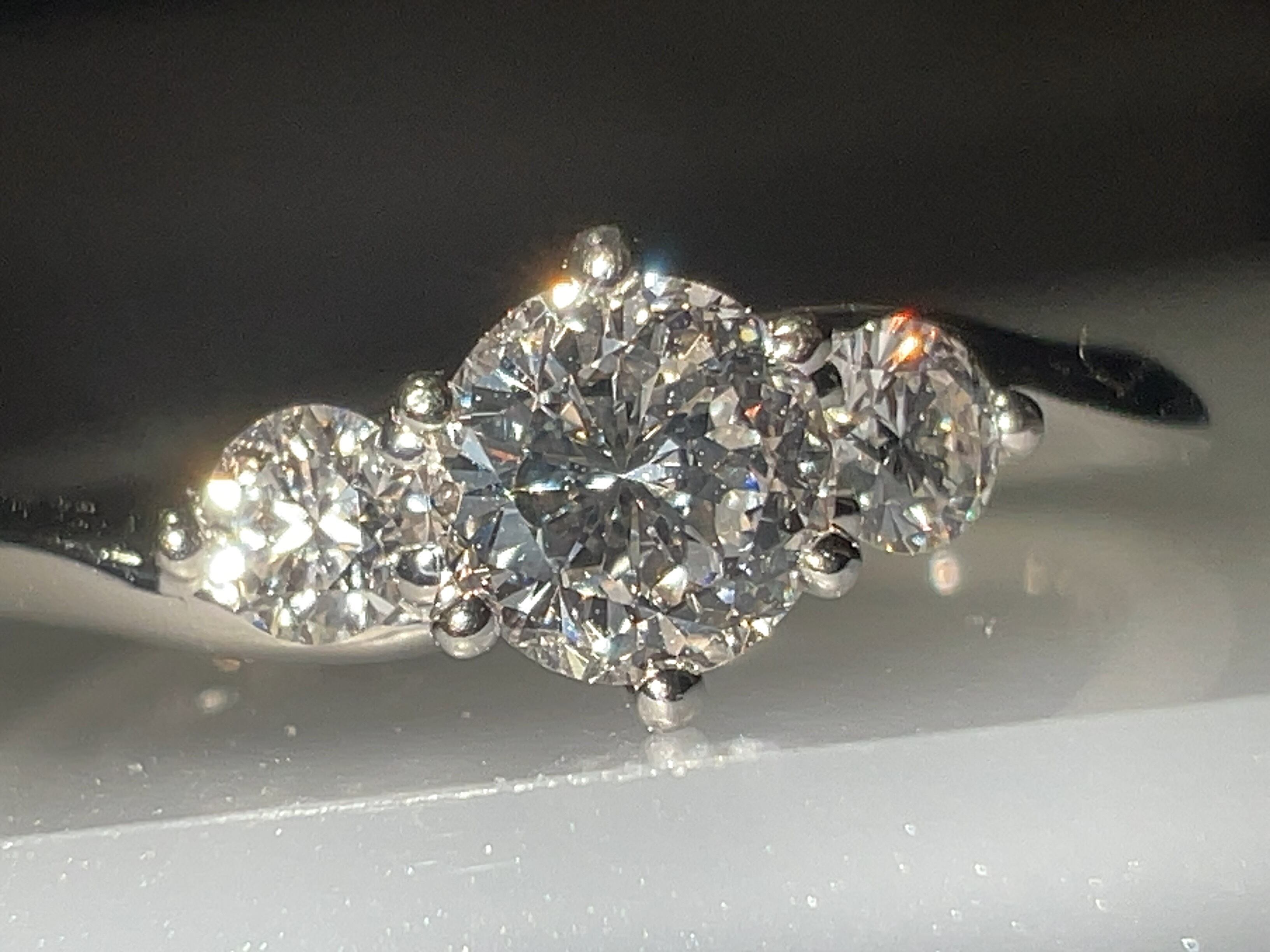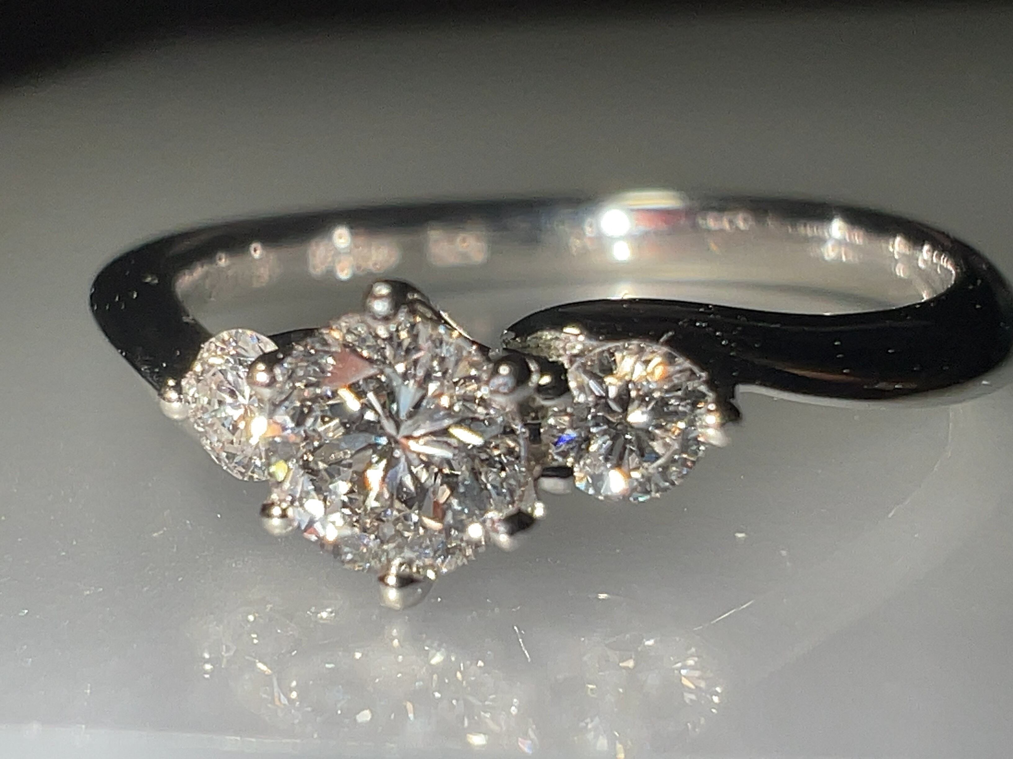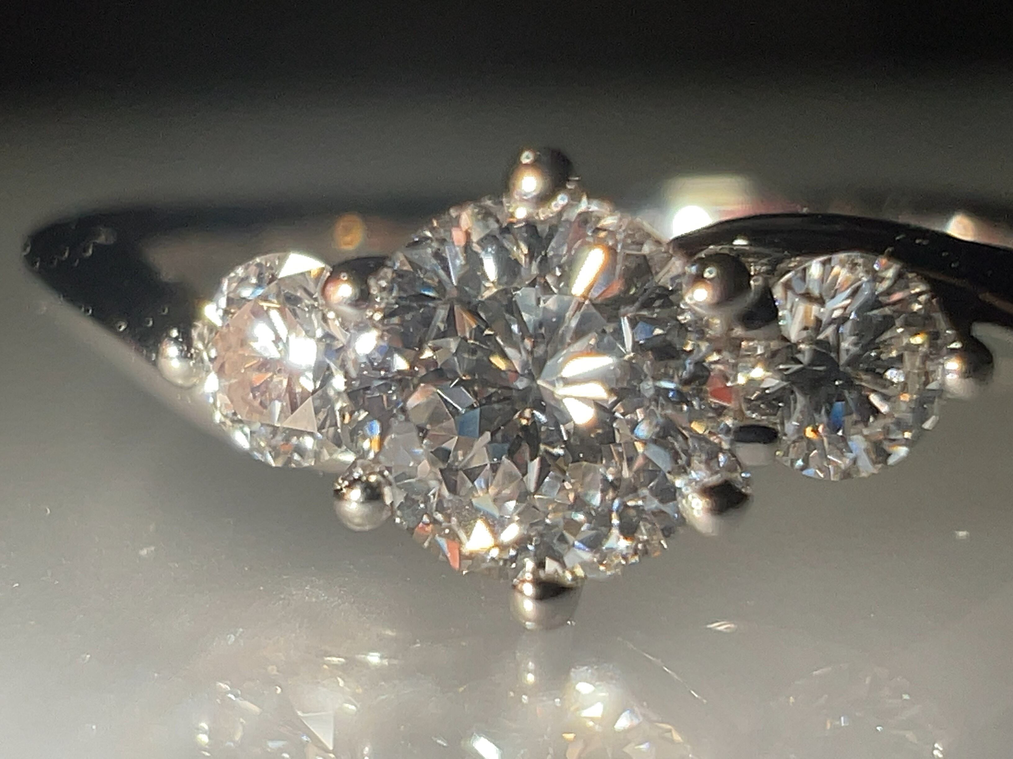 58面ラウンドブリリアントカットの輝きがテーブル面に光を集める構造に対して、144面ラウンドブリリアントカットは、ダイヤモンド全体が光るようにパビリオン部分にふくらみを持たせた構造になっており全面が広く輝きます。この違いが最も顕著に現われるのはダイヤモンドを傾けた時。わずかな光を拾って、どの角度でもこぼれるようにやわらかい光を放ち続けます。動かしたときにこそ、真価を発揮するのがこの144面カットのダイヤモンドなのです。(HP参照)